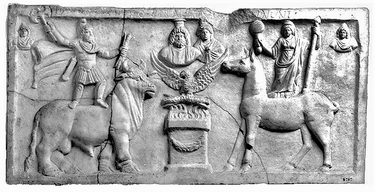 In this image from what’s today Budapest, you can seen Jupiter flanked by Castor & Pollux on the 1st row, 2nd shows J.Dolichenus & Juno with Iranic-style fire altar in middle, the solar/lunar archons, the jovian eagle on top
