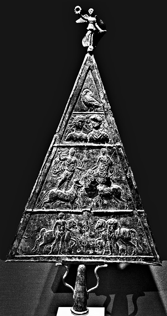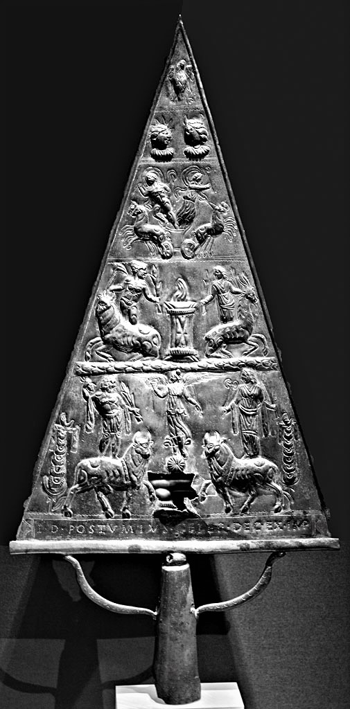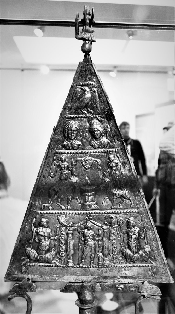 The first panel shows Castor & Pollux in their ancestral ashvin form with the spear standard & spears inherited by skanda-vishAkhau. Then we have Jupiter Dolichenus and Juno in their characteristic form. Above them are the solar and lunar archons. Finally we have the Jovian eagle and an undamaged Nike.