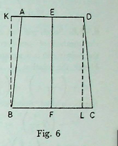 5.7 : Area of mahāvedi. The mahāvedi covers an area of 972 sq. padas. The rule gives hints how to calculate the area by proper transformation. The method is described here. The isosceles trapezium ABCD denoting mahāvedi has face, 24, base 30, and height 36 padas. For measuring the area, the portion DCL is cut off and placed in the northern side after inverting it and its new position becomes AKB (Fig. 6 ).