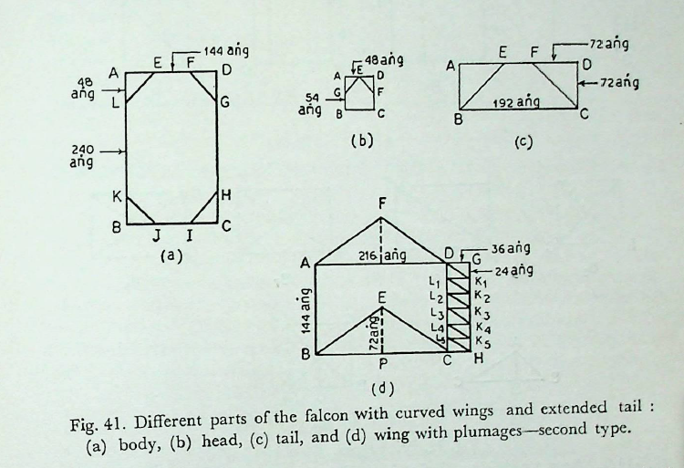 11.4. Construction of different parts of the falcon. Unlike the falcon of the first type detailed measurements of the various rectangles involved have not been given. However, with the indications given in the rule and the areas in the previous rules, the various parts can be constructed without difficulty.
