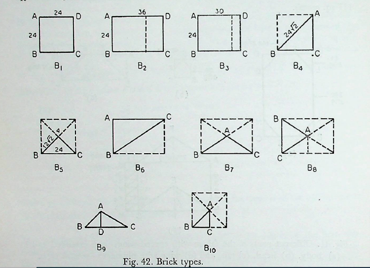 11.5-11.6. Type of bricks. The following ten types of bricks have been prescribed for covering the fire-altar (Fig. 42) :— B_{1} -square brick of side 1/5 pu, pañcami: 24 × 24 sq. aṅg.
