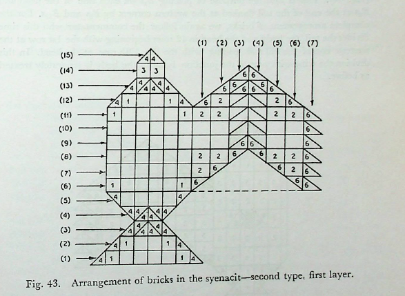 The fire-altar from the western end of the tail, through the body, upto the eastern tip of the head, excluding the wings, is divided into 15 rows south-north. Beginning with the western end as the first layer, the number and types of bricks are as follows :-