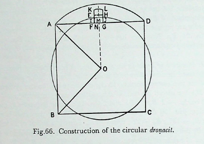 The next step is to convert the above-mentioned square into a circle by the method given in sūtra Bśl. 2.9. and already applied in the case of the fire-altar in the form of the chariot wheel. Let ABCD be the square of side equal to 327 aṅg. 9 tila. (Fig. 66 ). EFGH is the ṣoḍāśi brick placed at the middle of the eastern side AD of the square. With O as centre and OM as radius a circle equal in area of the square ABCD is drawn, cutting EFGH by the curved line (dhanurvakrā) IJ. The part of the sodasi brick IFGJ cut by the circle is transferred to the top of the remain- ing portion, as KEHL. Now, KIJL, whose area remains the same as that of a ṣoḍaśi brick, represents the handle of the circular trough (also called oṣṭha).